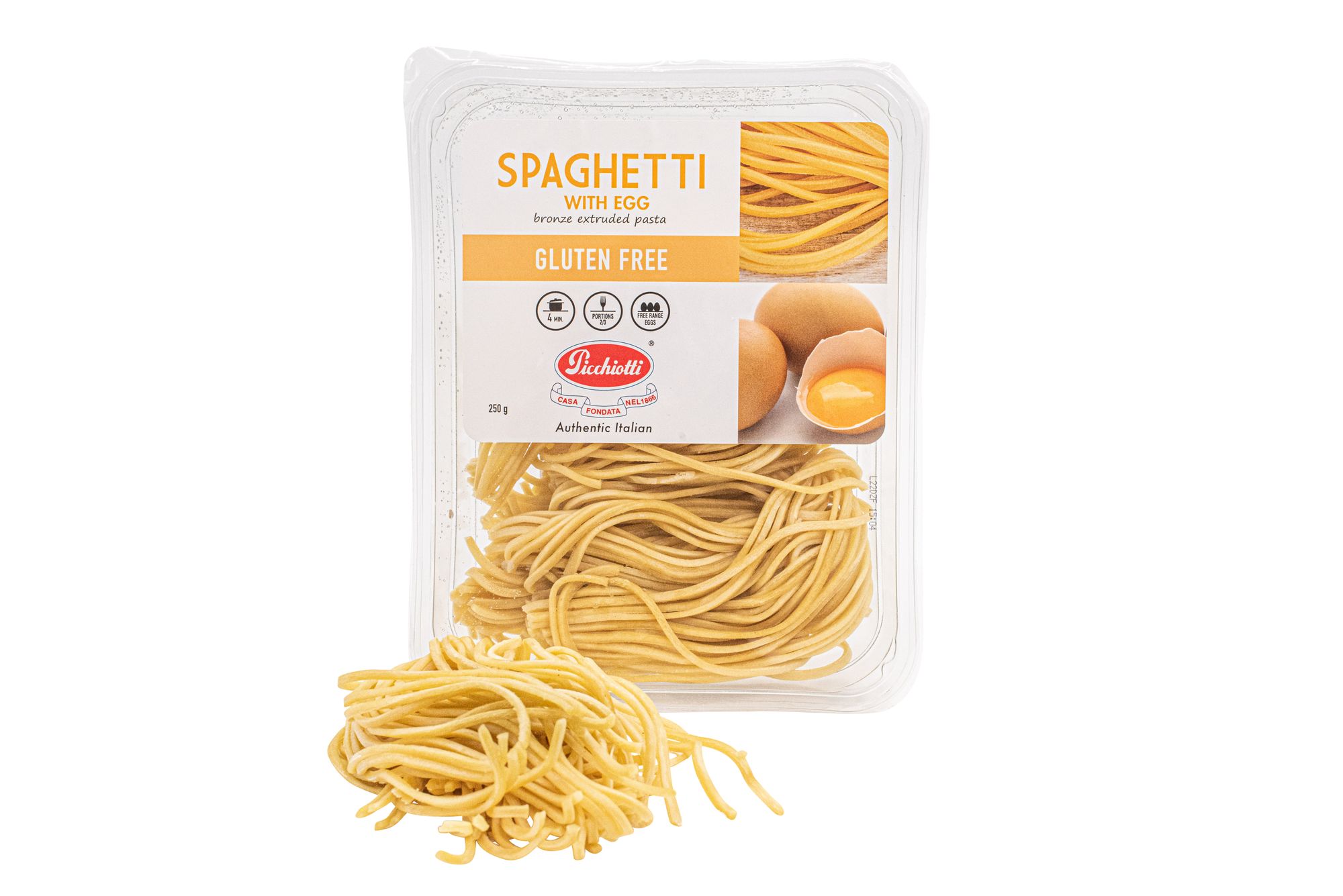 The perfect pasta for carbonara, marinara or even caccio e pepe Picchiotti Gluten Free Spaghetti is fresh, delicious and cooks to al dente in 3-4 minutes. Presented in clear trays packed in an attractive upright cardboard display box they are ready to stack in store. This pasta is made in Tuscany by a respected multi-generational family-owned business who use authentic bronze die pasta making equipment. Bronze dies cause friction which create a rougher surface – perfect for the pasta sauce to stick. All the Pichiotti Gluten Free pasta range is made for us to Australian gluten free standards, which means it contains ‘no detectable gluten’. That this spaghetti is gluten free is a happy story because it also delicious and has the same flavour and texture as traditional pasta. Buon appetitio!