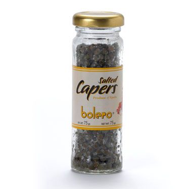 These are tiny lillyput capers in a gorgeous little glass jar. Just wash the salt off and they are ready to eat. These baby capers are sharp and sweet, a great burst of flavour.